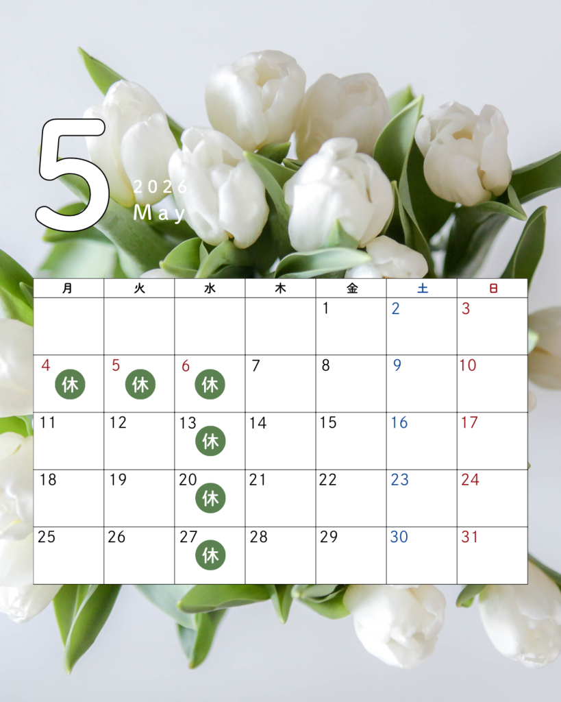 4日(月)・5日(火)・日(水)・13日(水)・20日(水)・27日(水)です。
