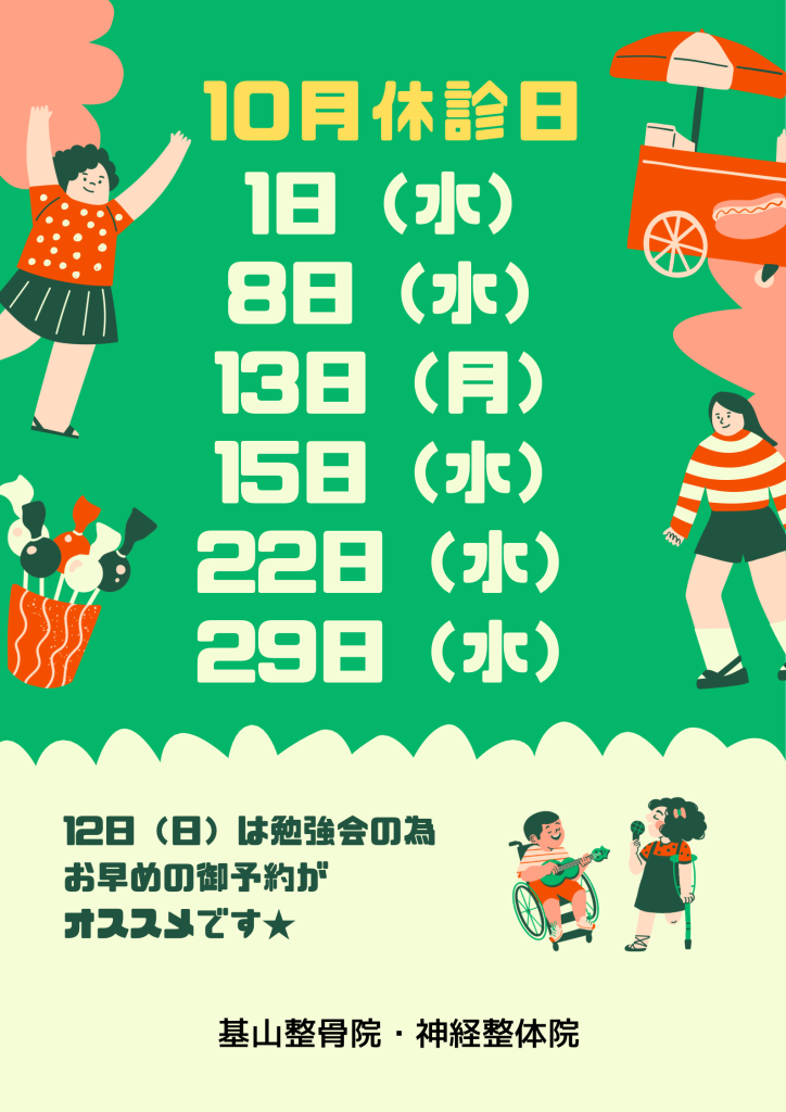 10月の休診日 投稿日 2025年9月22日 更新日 2025年10月28日 著者 toukou_ks カテゴリー お知らせ 基山整骨院・神経整体院の10月休診日です!1日(水)・8日(水)・13日(月・祝)・15日(水)・22日(水)・29日(水)第2日曜日の12日(日)は神経整体勉強会の為、少し短縮して診療いたしますのでお早めのご予約をオススメしています★