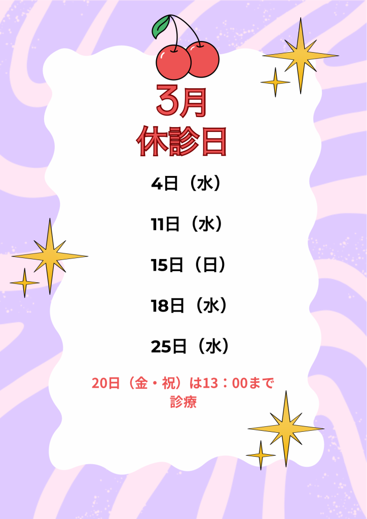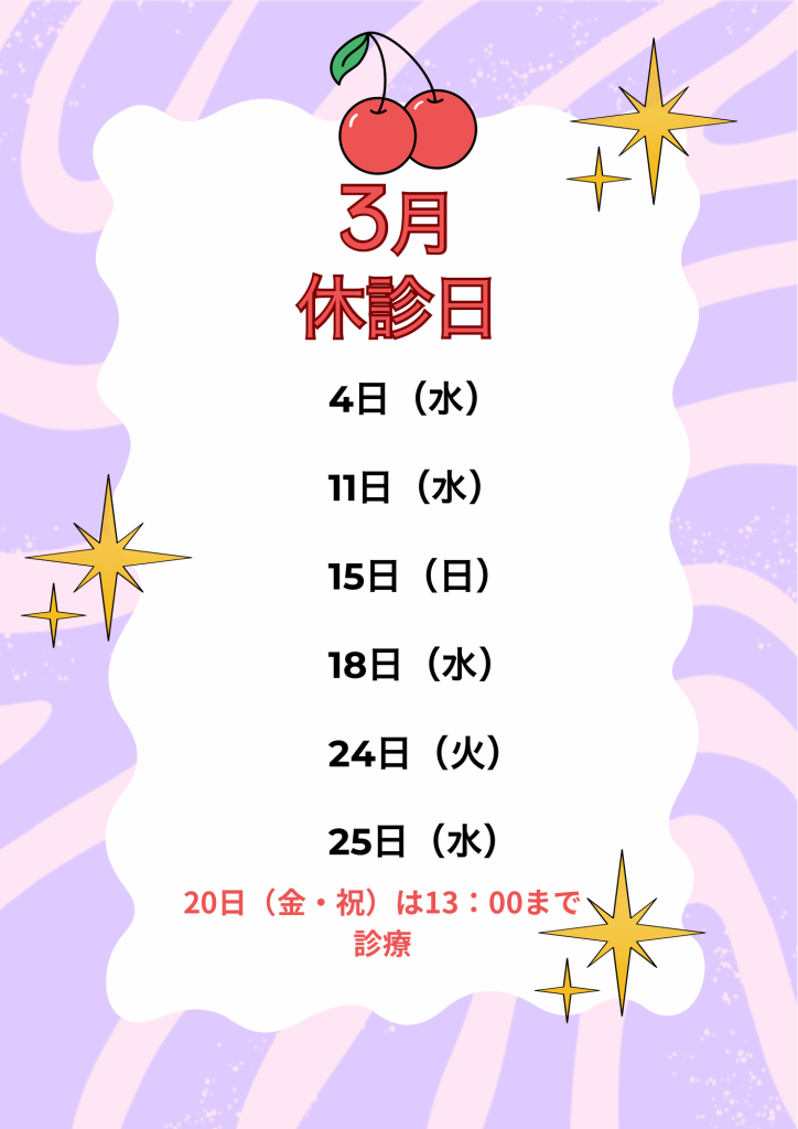 3月休診日のお知らせ 投稿日 2026年2月24日 著者 toukou_ks カテゴリー お知らせ 基山整骨院・神経整体院、3月の休診日です!4日(水)・11日(水)・18日(水)・20日(金・祝)・25日(水)です。20日(金・祝)は9:00〜13:00まで営業いたしますので、お間違えのないようお願いいたします。いよいよ花粉が飛び始め、鼻を吸っている方・くしゃみ・中には熱が出たりする方もいらっしゃいます。くれぐれも体調管理にはお気をつけください!